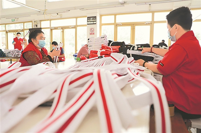 7月11日◇,青岛西海岸新区康源残疾人辅助性就业中心内,残疾人职工在工作台上忙碌。 西海岸新区进一步推进残疾人辅助性就业,通过对残疾人进行培训,让残疾人自食其力◁,既提高了残疾人的自信心,又减轻了其家庭负担。本报通讯员 王培珂摄(工人日报7月13日2版)