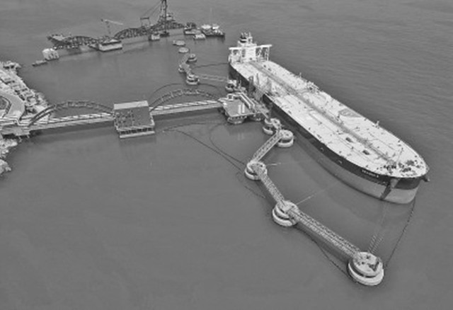 日前,山东港口烟台港原油管道复线(干线)正式启输。该项目从烟台港西港区出发…-,直达东营输油站▼,全长370余公里。该管道与原有的烟台至淄博长输管道形成“双管齐下…▲”的新布局,输送能力由原来的每年2000万吨提升至4000万吨。图为7月8日,在烟台港西港区30万吨级原油码头,一艘油轮通过原油管道卸油。唐克摄(光明日报7月11日10版)