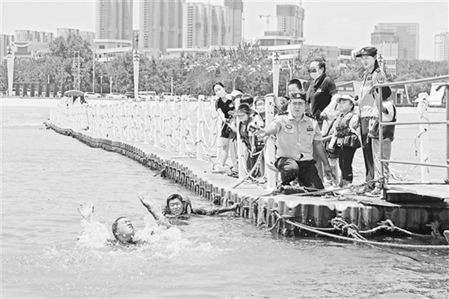 7月8日◇,烟台市公安局清泉寨海岸派出所联合专业救援队伍•…◇,在海边娱乐场所向游客开展防溺水安全宣传。连日来,针对海边游客增多的实际,清泉寨海岸派出所民警通过开展巡逻防范-、强化警示提醒以及组织专业救援人员现场演示落水后如何开展救援和自救等方式,进一步提升游客们的安全意识和自救能力◁▽◆。臧保东摄(工人日报7月14日6版)