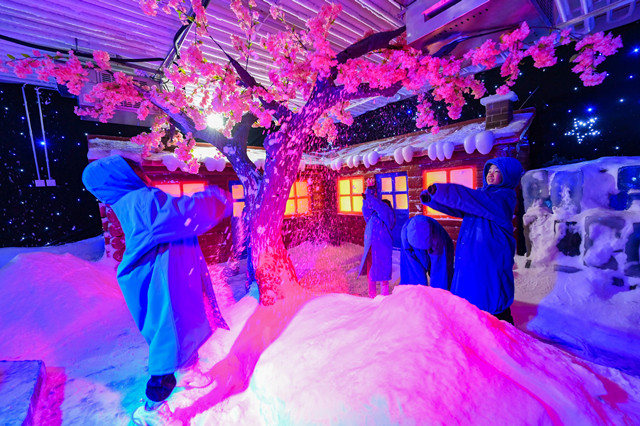 入伏首日,人们来到山东省青州古城景区室内冰雪世界,赏冰雕、打雪仗○★、滑雪圈,乐享清凉。新华社发(王继林摄)
