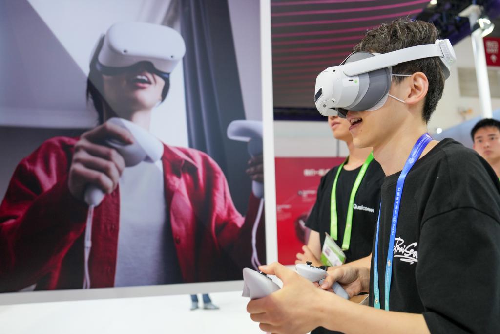 7月17日,参观者在数字科技链展区高通展台体验搭载了高通公司芯片的产品…。新华社记者 鞠焕宗 摄