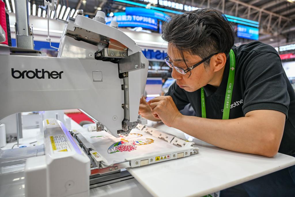7月16日,工作人员在链博会先进制造链展区调试兄弟(中国)商业有限公司研发的商用绣花机☆☆▲。新华社记者 陈朔 摄