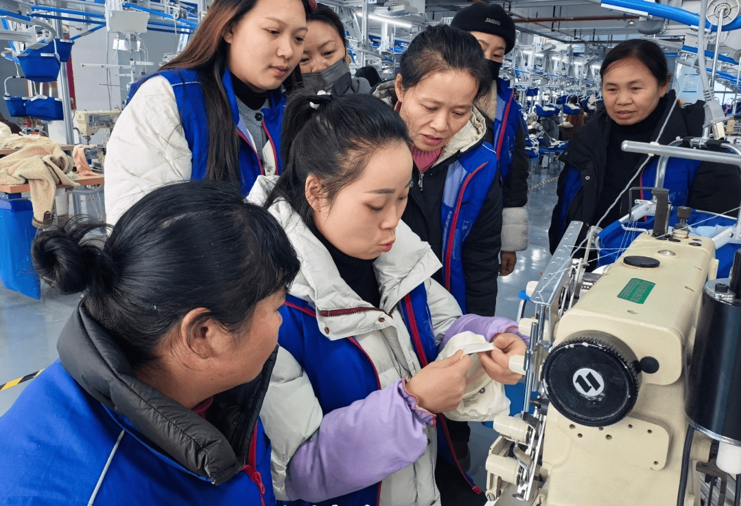 伴着“滴答滴答…▷”的缝纫机声◁★,车间内▽,一堂培训课正在进行。“上腰时●☆=,一定要把裤头切布的尺寸控制在2厘米,缝纫的时候要对齐布料,不然就会腰头不平整。•▲”公司生产部1组车缝组长申时琴仔细叮嘱新入职员工▲◆•,“产品规格不达标就要返工…▪★,一来耽误公司交货,二来耽误大家挣钱。★☆△”